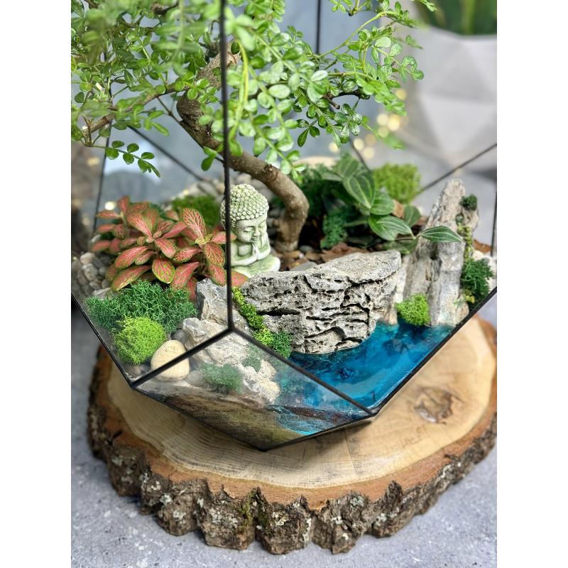 Для настоящих ценителей прекрасного отличным подарком к любому празднику станет вот такой флорариум. Бонсай, папоротники, фиттония, зеленый мох – все это сочетается в гармоничной симфонии зелени, а фигурка Будды настраивает на медитативный лад. Если ваша душа искала уголок, где можно отдохнуть и прийти в умиротворенное состояние в этом суетном мире – поздравляем, вы только что нашли этот уголок, который сможете установить как в комнате дома, так и украсить им свой офис.