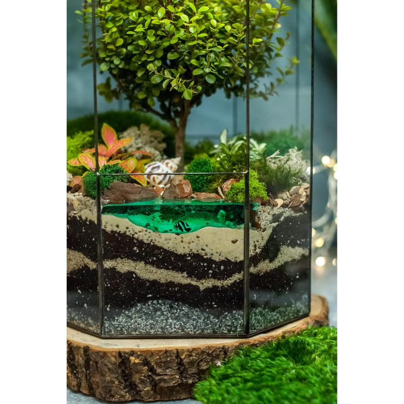 • В центре флорариума раскинулся великолепный бонсай, символизирующий силу и долговечность природы. Вокруг него изящно расположены разнообразные растения — от ярких суккулентов до нежных мхов, создающих эффект волшебного леса.