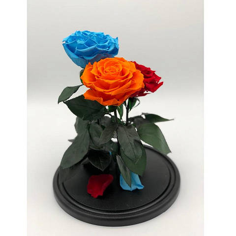 В комплекте 3 розы, стеклянная колба на подставке, памятка по уходу, упаковка