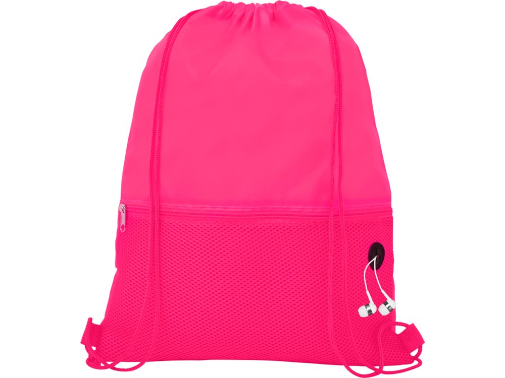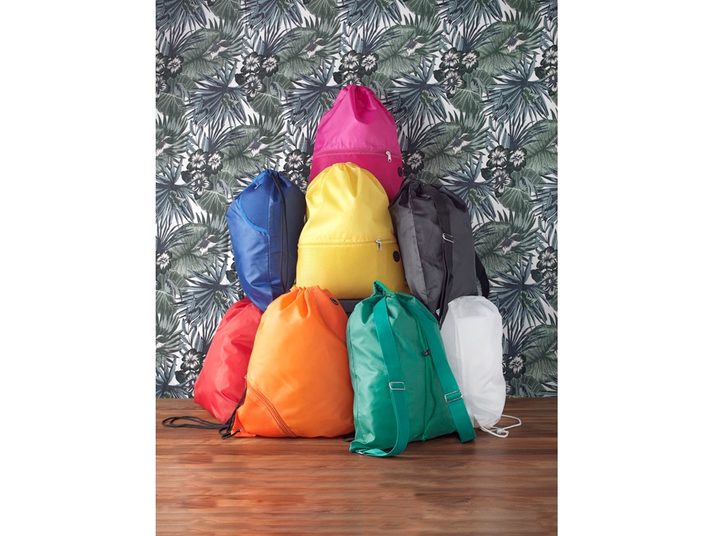 Рюкзак со шнурком и главным отделением на шнуровке в цвет изделия. Имеет один передний сетчатый карман на молнии и порт для наушников. Прочность до 5 кг.
