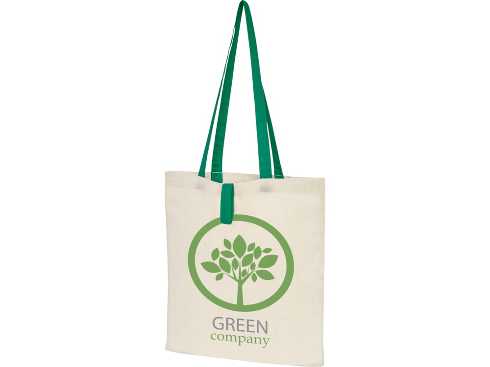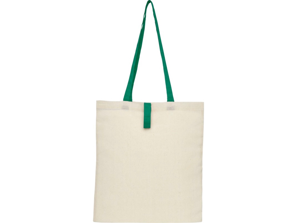 Эко-сумка с открытым основным отделением и цветными ручками, раскладывающаяся в высоту на 32 см. Имеет ремень с пуговичной застежкой, чтобы закрывать сумку. Прочность до 8 кг.