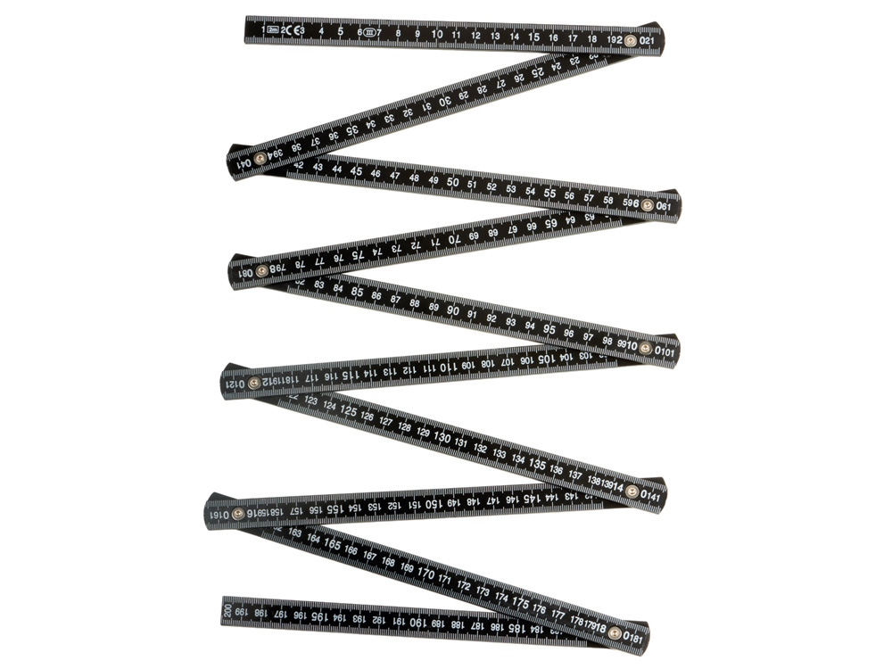 Складная линейка длиной 2 м. Двусторонняя линейка со шкалой на 200 см с одной стороны и 79 дюймов с другой. Линейка состоит из нескольких складных частей. АБС-пластик.