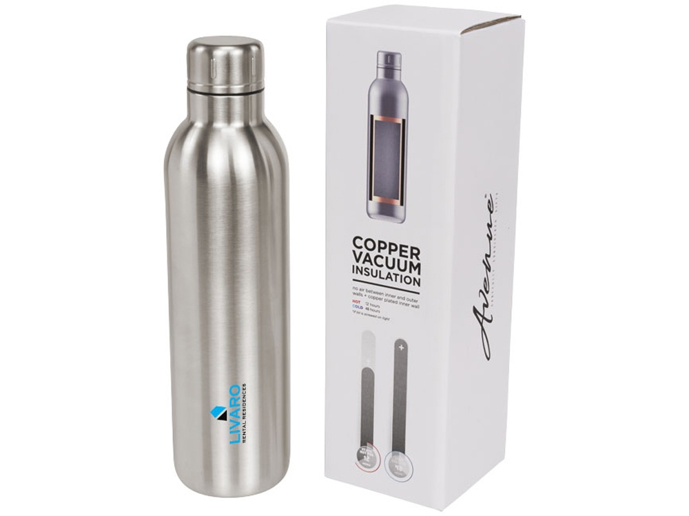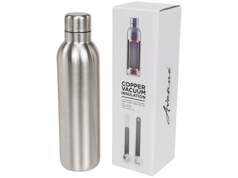Спортивная бутылка Thor с вакуумной изоляцией объемом 510 мл. Прочная бутылка с двойными стенками из нержавеющей стали и вакуумной медной изоляцией сохраняет напитки холодными в течение 48 часов и горячими в течение не менее 12 часов. Конструкция бутылки предотвращает образование конденсата на внешней стороне. Модное, прочное порошковое покрытие. Герметичная завинчивающаяся крышка из нержавеющей стали. Объем – 510 мл. Предлагается в подарочной коробке Avenue. Нержавеющая сталь.