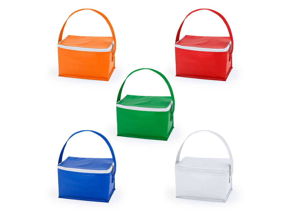 Сумка-холодильник с подкладкой из изотермического алюминия на 6 банок из ПВХ. Ручка для переноски и застежка-молния.