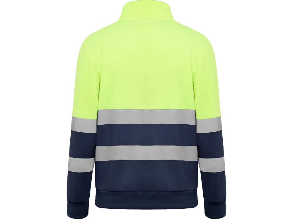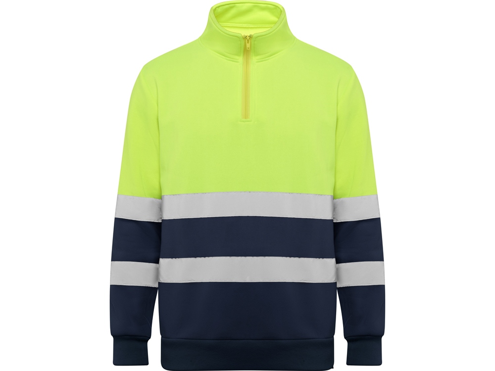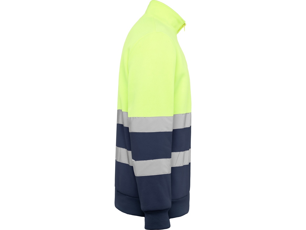 Свитшот с воротом на молнии, предназначен для использования в условиях плохой видимости. Внутри воротника отстрочка для усиления. Горизонтальные полоски со светоотражением на груди и рукавах. Манжеты и низ из рибовой ткани 1х1.
