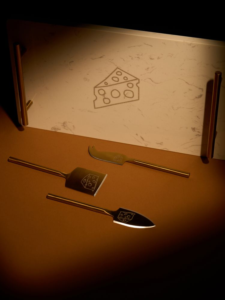 Золотистый цвет ручек и трех ножей подчеркивает статус всего набора и возвышенность самой сырной дегустации. При нарезке мягких сортов сыра особенно важно сохранить эстетичный вид ломтиков, поэтому здесь не обойтись без специальных ножей. Нож-лопатка удобен как для нарезки, так и для сервировки мягких и полутвердых сортов, а еще им можно красиво раскрошить твердый сыр. А нож с раздвоенным кончиком можно также использовать в качестве элегантной вилки. Листовидный нож для твердых сортов — это проверенная классика, которой можно доверить пармезан.