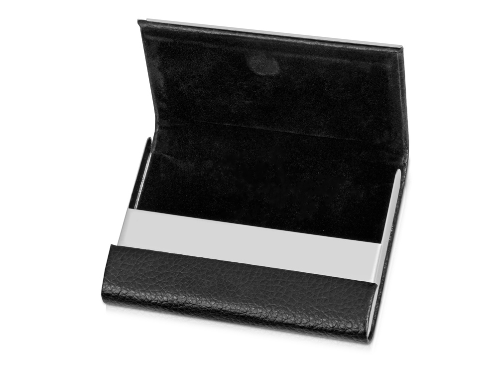 Визитница на магните выполнена из металла с искусственной кожей снаружи и черном бархатом внутри.