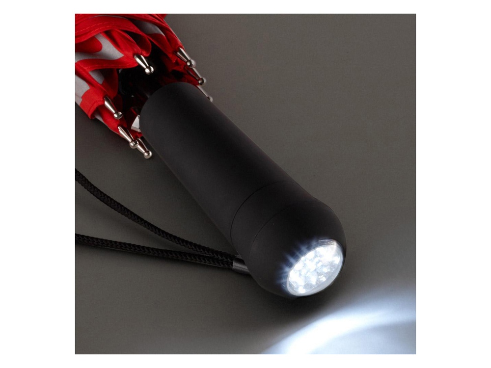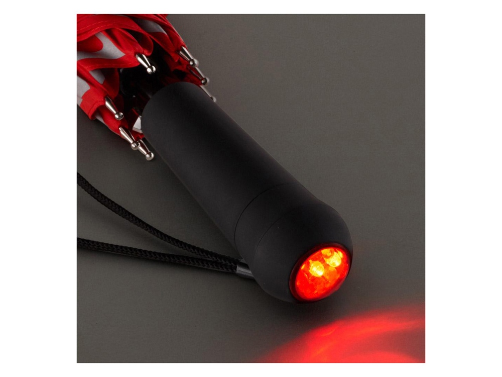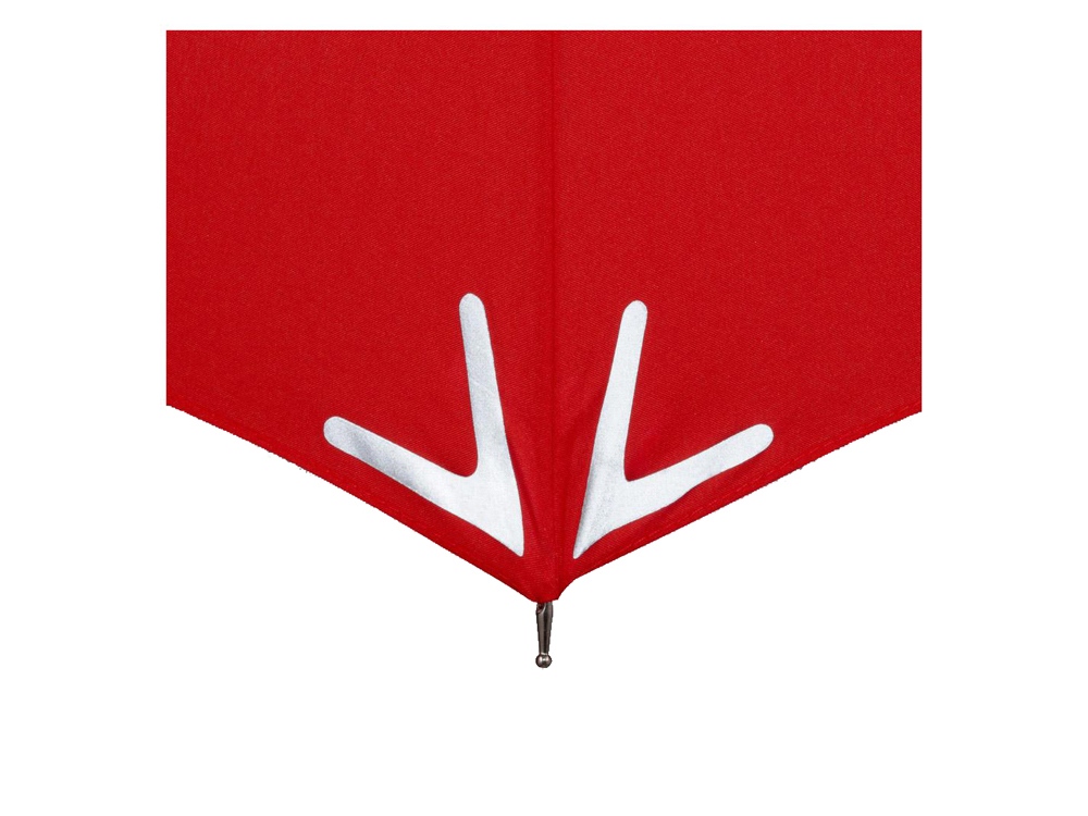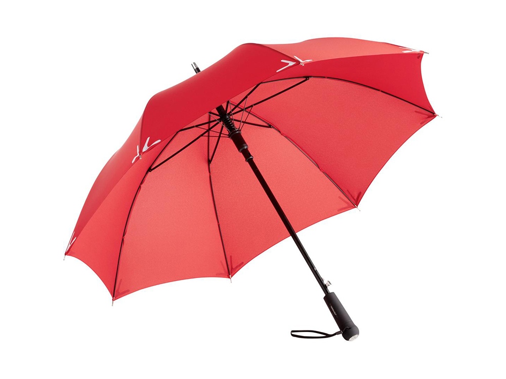 Полуавтоматический зонт-трость со светоотражающими элементами на куполе из запатентованного материала 3M™ Scotchlite™ обеспечит дополнительную защиту в темное время суток. В ручку встроен LED фонарик, который работает в двух режимах - постоянный белый свет и мерцающий красный. Батарейка в комплекте.